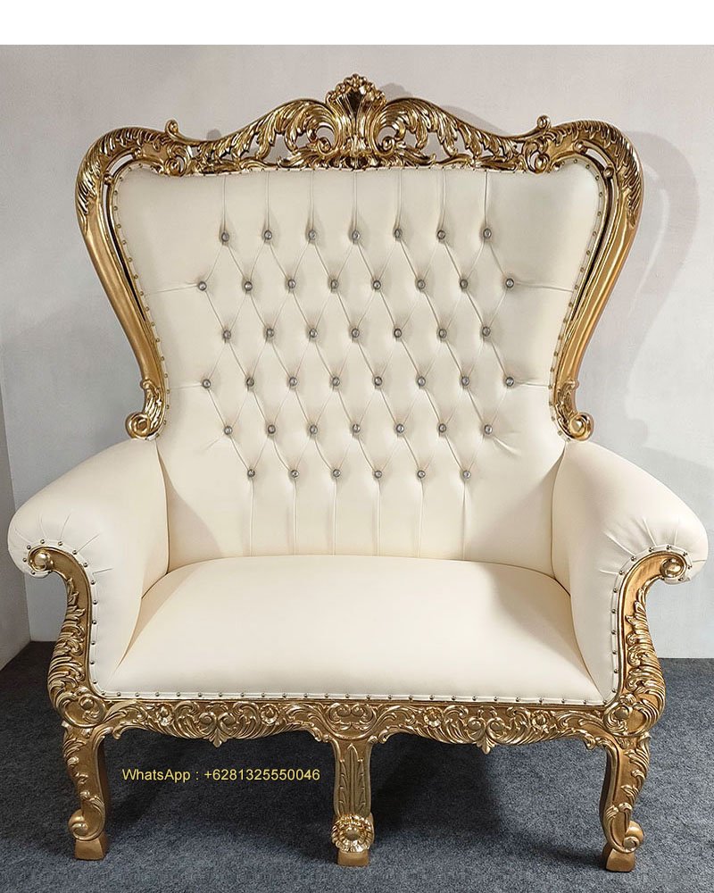 Adora Throne 2 Seater, Mahogany wood, Gold with gold foil, Off White artificial leather, Gold artificial leather, crystal depth button, nice carving, beautiful finish, good quality, good price. Living room furniture, Wedding decoration and special event. Ready for Export and Indonesia delivery.