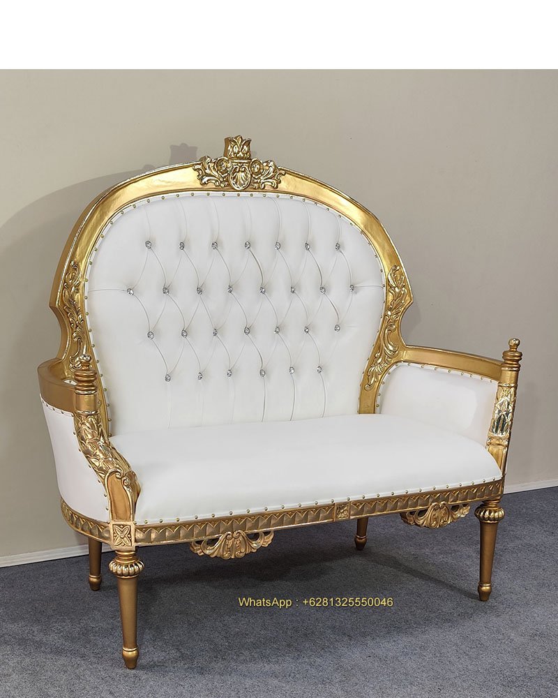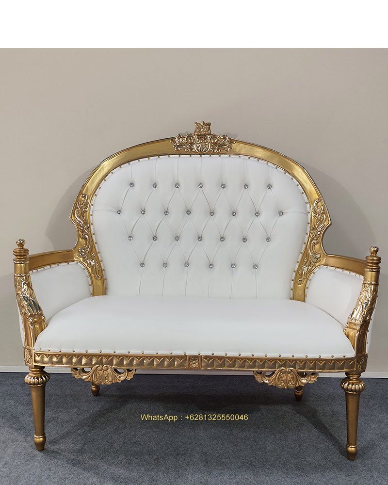 Agatha Sofa 2 seater, Mahogany wood, Gold with gold foil, White artificial leather, Crystal depth button. Living room furniture, Wedding decoration. Good quality, good price, nice carving, beautiful finish. Export and Indonesia delivery.