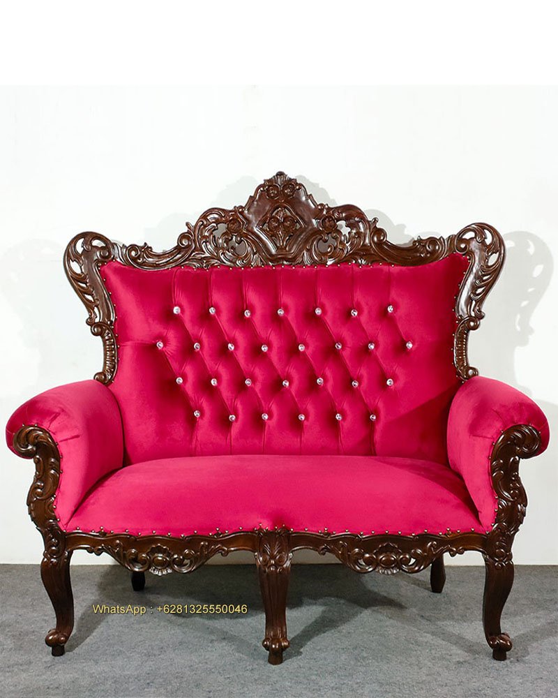 Akila Throne 2 Seater, Mahogany wood, Tea Brown finish, Red velvet fabric, crystal depth button, nice carving, beautiful finish, good quality, good price. Living room furniture, Wedding decoration and special event. Ready for Export and Indonesia delivery.