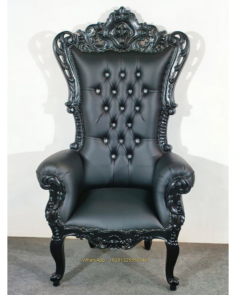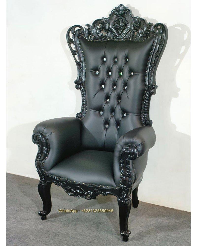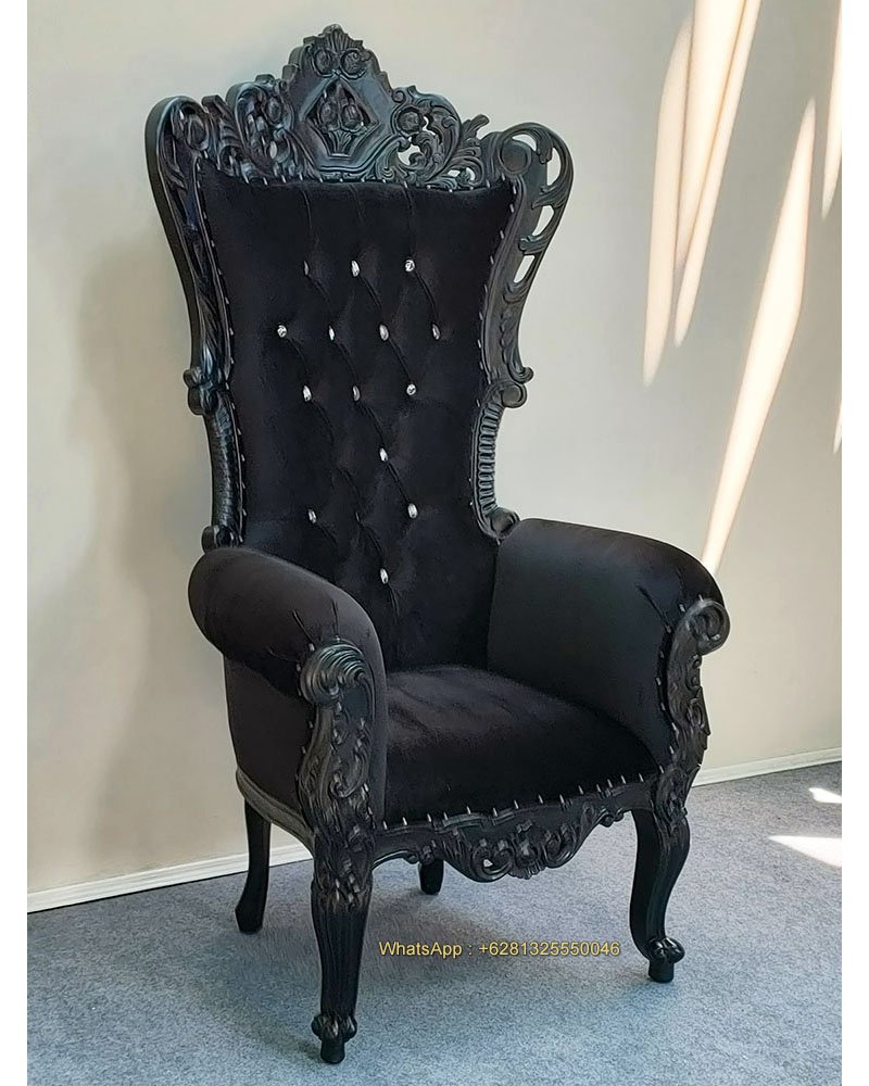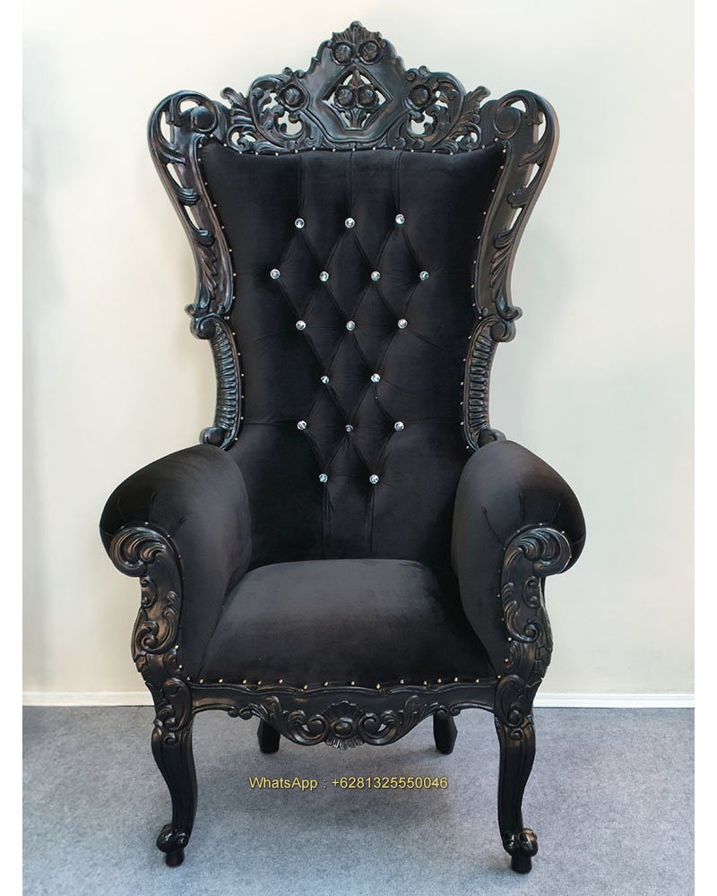 Akila Throne Chair, Mahogany wood, Black finish ( Plain Black ), Black artificial leather, Black velvet fabric, crystal depth button, nice carving, beautiful finish, good quality, good price. Living room furniture, Wedding decoration and special event. Ready for Export and Indonesia delivery.