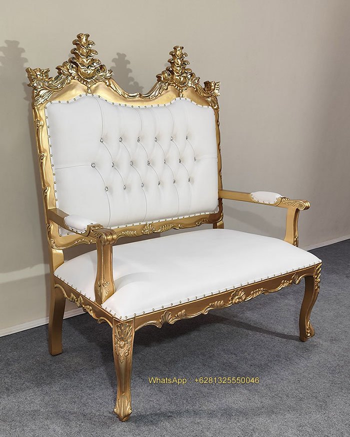 Allison 2 Seater with Arm, Mahogany wood, Gold with gold foil, White artificial leather, Crystal depth button, nice carving, beautiful finish, good quality, good price. Living room furniture, Wedding decoration and special event. Ready for Export and Indonesia delivery.