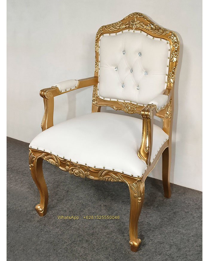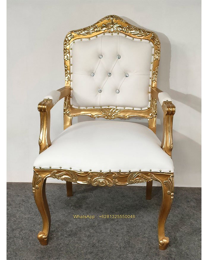 Amelia Chair with Arm, Mahogany wood, Gold with gold foil, White artificial leather, Crystal depth button, nice carving, beautiful finish, good quality, good price. Living room furniture, Dining room, Wedding decoration. Ready for Export and Indonesia delivery.