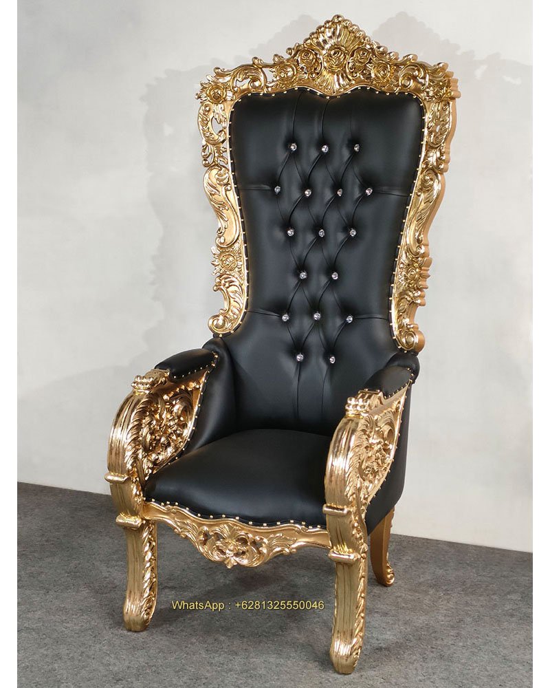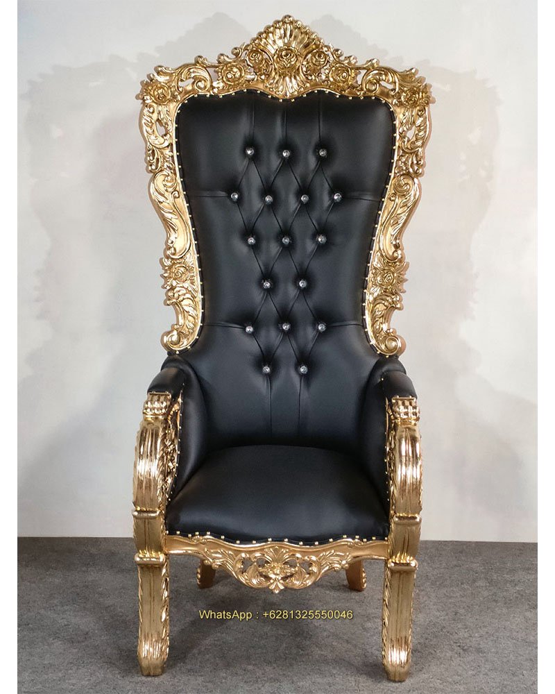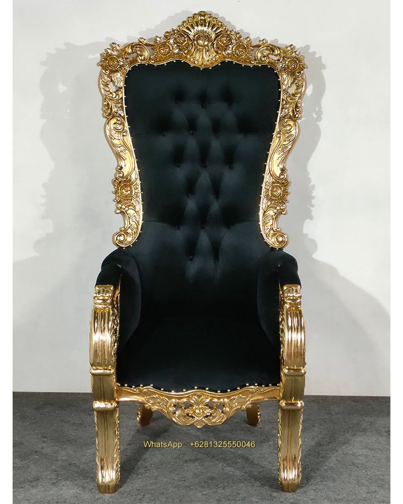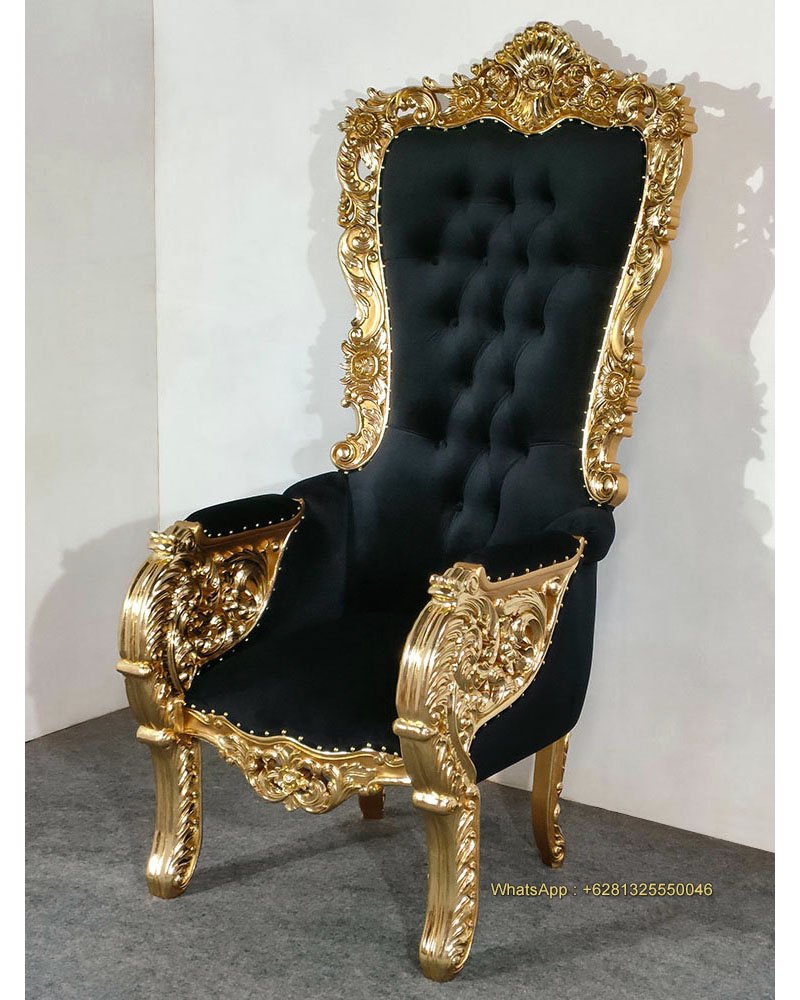 Asher Throne Chair, Mahogany wood, Gold with gold foil, Black artificial leather with crystal depth button, Black velvet fabric with fabric depth button, nice carving, beautiful finish, good quality, good price. Living room furniture, Wedding decoration and special event. Ready for Export and Indonesia delivery.