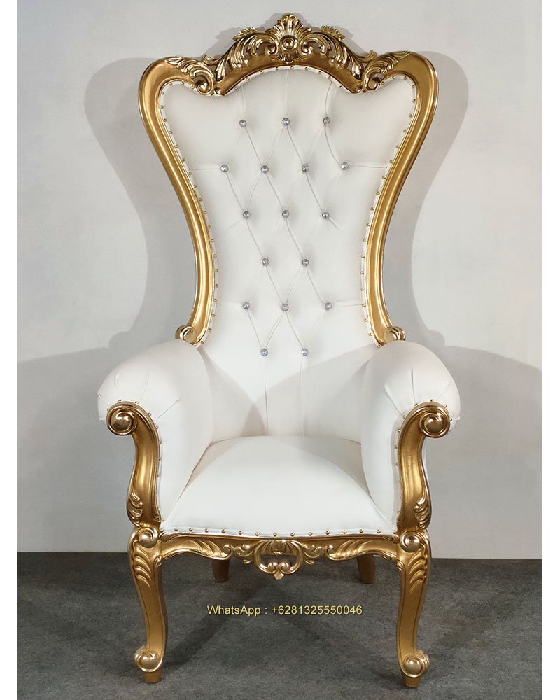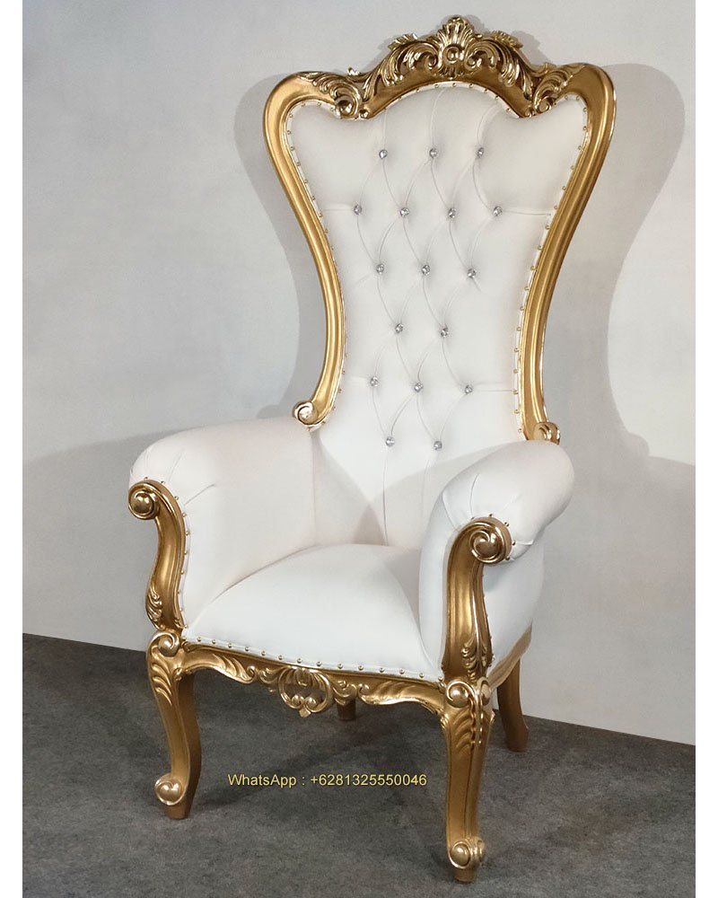 Barbara Throne Chair, Mahogany wood, Gold with gold foil, White artificial leather, Crystal depth button, nice carving, beautiful finish, good quality, good price. Living room furniture, Wedding decoration and special event. Ready for Export and Indonesia delivery.