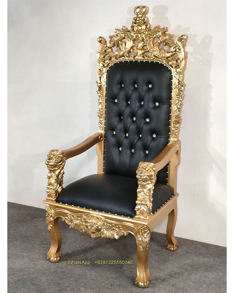 Beatriz Throne Chair, Mahogany wood, Gold with gold foil, Black artificial leather, Crystal depth button, nice carving, beautiful finish, good quality, good price. Living room furniture, Wedding decoration and special event. Ready for Export and Indonesia delivery.