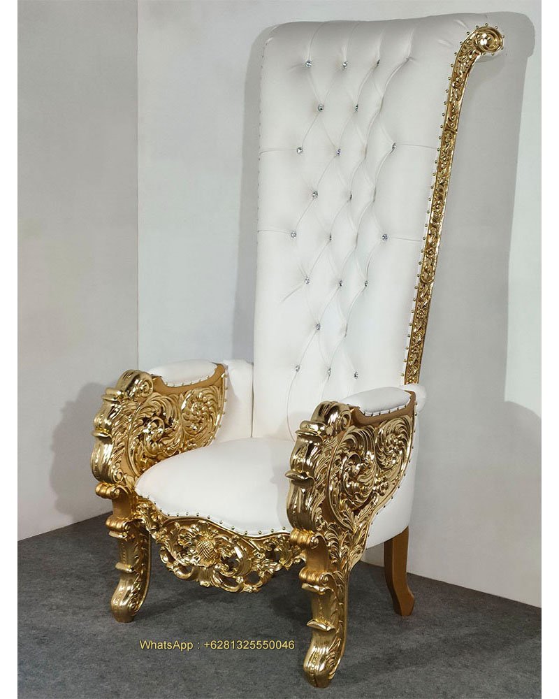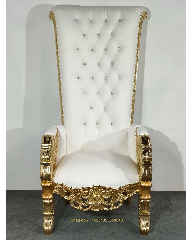 Bette Throne Chair, Mahogany wood, Gold with gold foil, White artificial leather, Crystal depth button, nice carving, beautiful finish, good quality, good price. Living room furniture, Wedding decoration and special event. Ready for Export and Indonesia delivery.