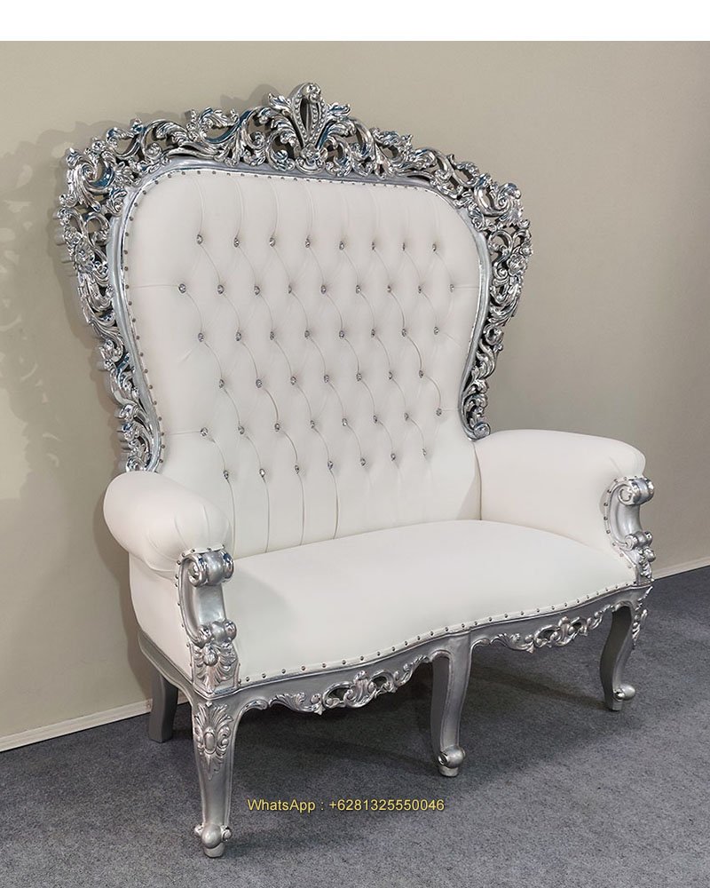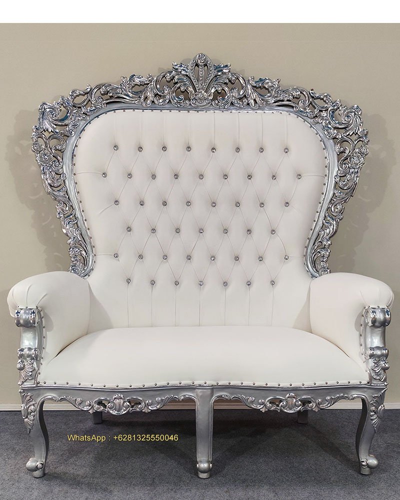 Camila Throne 2 Seater, Mahogany wood, Silver with silver foil, White artificial leather, Crystal depth button, nice carving, beautiful finish, good quality, good price. Living room furniture, Wedding decoration and special event. Ready for Export and Indonesia delivery.