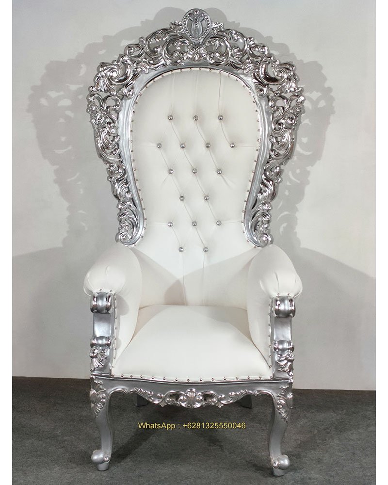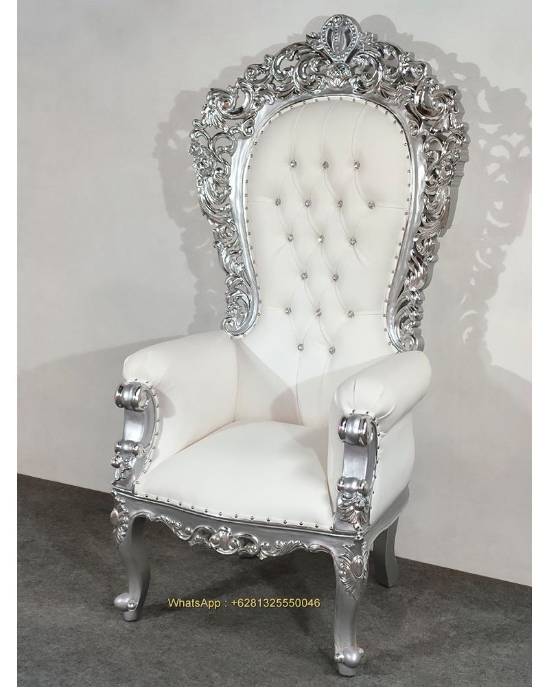 Camila Throne Chair, Mahogany wood, Silver with silver foil, White artificial leather, Crystal depth button, nice carving, beautiful finish, good quality, good price. Living room furniture, Wedding decoration and special event. Ready for Export and Indonesia delivery.