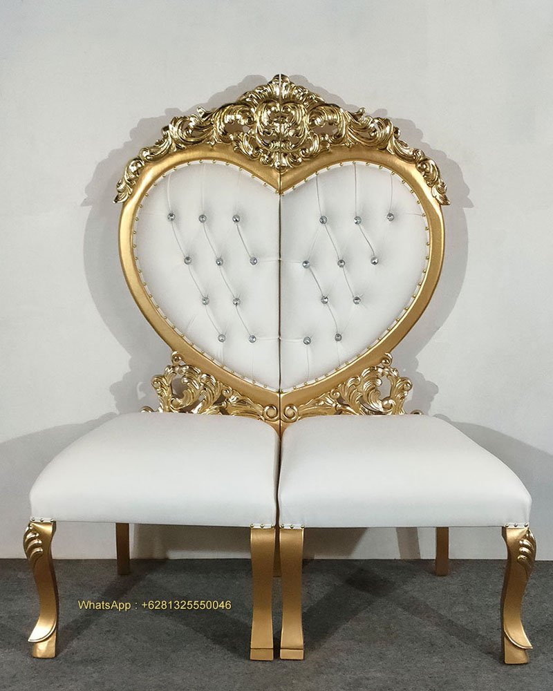 Corazone Chair Set ( 2 pcs ), Mahogany wood, Gold with gold foil, White artificial leather, Crystal depth button, nice carving, beautiful finish, good quality, good price. Living room furniture, Wedding decoration and special event. Ready for Export and Indonesia delivery.
