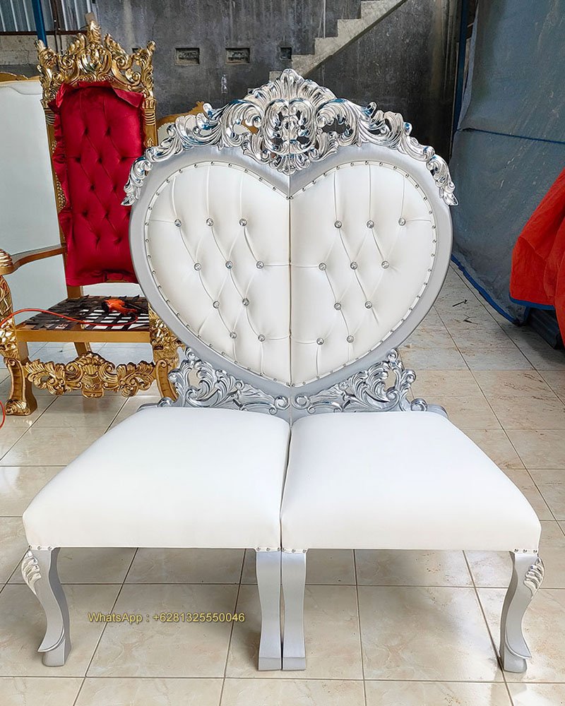 Corazone Chair Set ( 2 pcs ), Mahogany wood, Silver with silver foil, White artificial leather, Crystal depth button, nice carving, beautiful finish, good quality, good price. Living room furniture, Wedding decoration and special event. Ready for Export and Indonesia delivery.