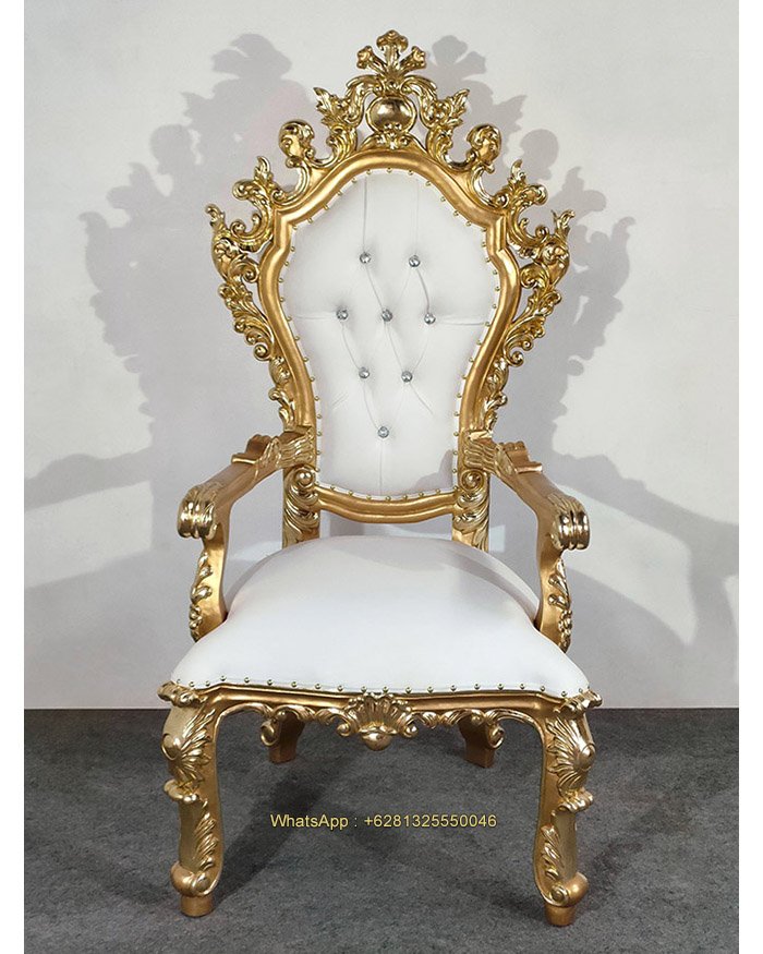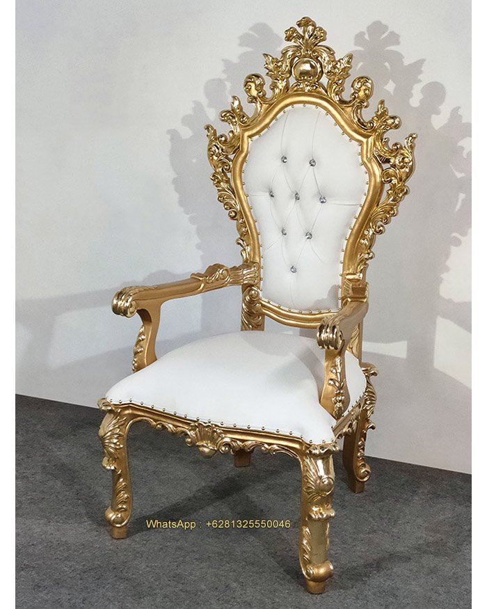 Dorcas Chair with Arm, Mahogany wood, Gold with gold foil, White artificial leather, Crystal depth button, nice carving, beautiful finish, good quality, good price. Living room furniture, Dining room, Wedding decoration. Ready for Export and Indonesia delivery.