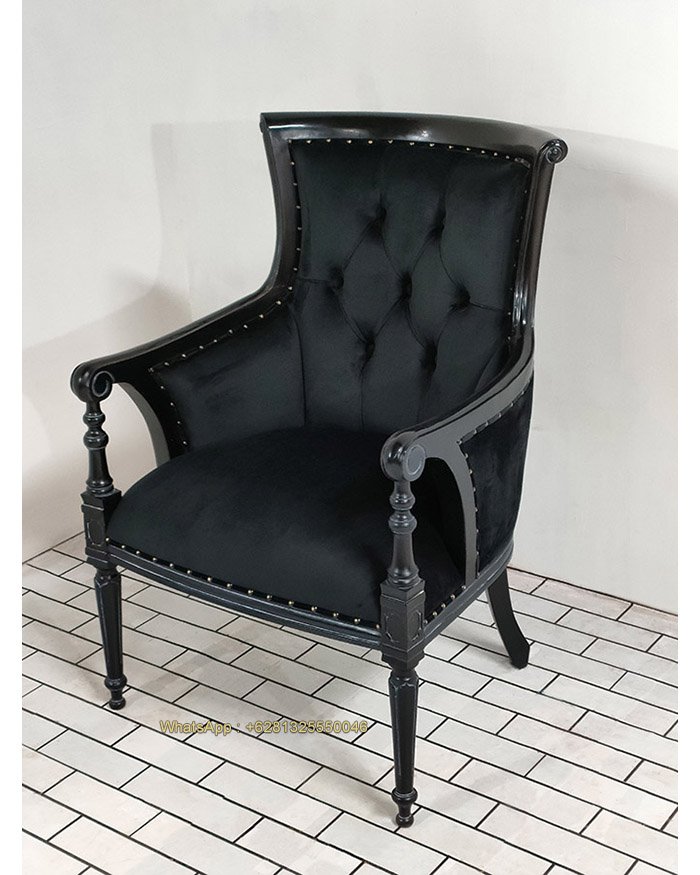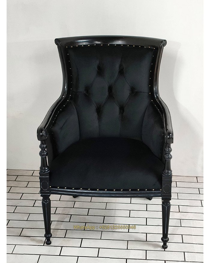 Dutch Chair, Mahogany wood, Black Antique ( White Glaze ), Black velvet fabric, Fabric depth button, nice carving, beautiful finish, good quality, good price. Living room furniture, Dining room, Wedding decoration. Ready for Export and Indonesia delivery.