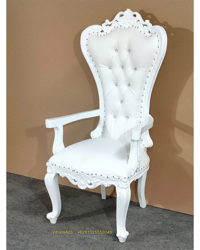 Emma Chair with Arm, Mahogany wood, White finish ( Plain White ), White artificial leather, Crystal depth button, nice carving, beautiful finish, good quality, good price. Living room furniture, Dining room, Wedding decoration. Ready for Export and Indonesia delivery.
