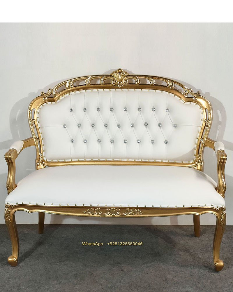 Grace 2 Seater with Arm, Mahogany wood, Gold with gold foil, White artificial leather, Crystal depth button, nice carving, beautiful finish, good quality, good price. Living room furniture, Dining room, Wedding decoration. Ready for Export and Indonesia delivery.
