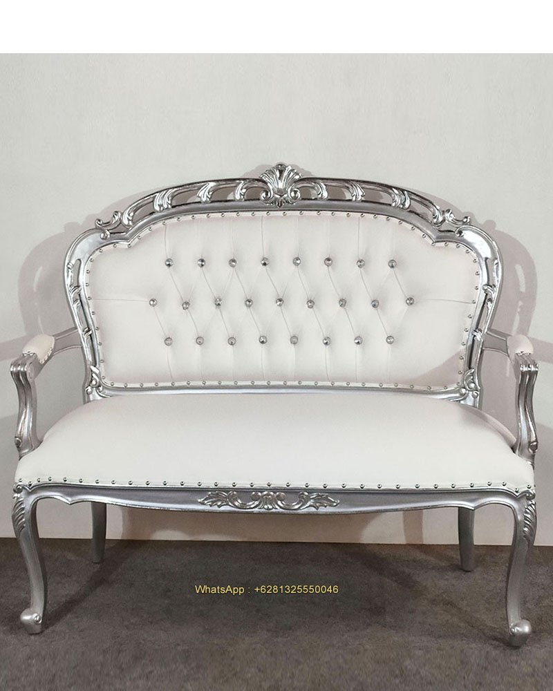 Grace 2 Seater with Arm, Mahogany wood, Silver with silver foil, White artificial leather, Crystal depth button, nice carving, beautiful finish, good quality, good price. Living room furniture, Dining room, Wedding decoration. Ready for Export and Indonesia delivery.