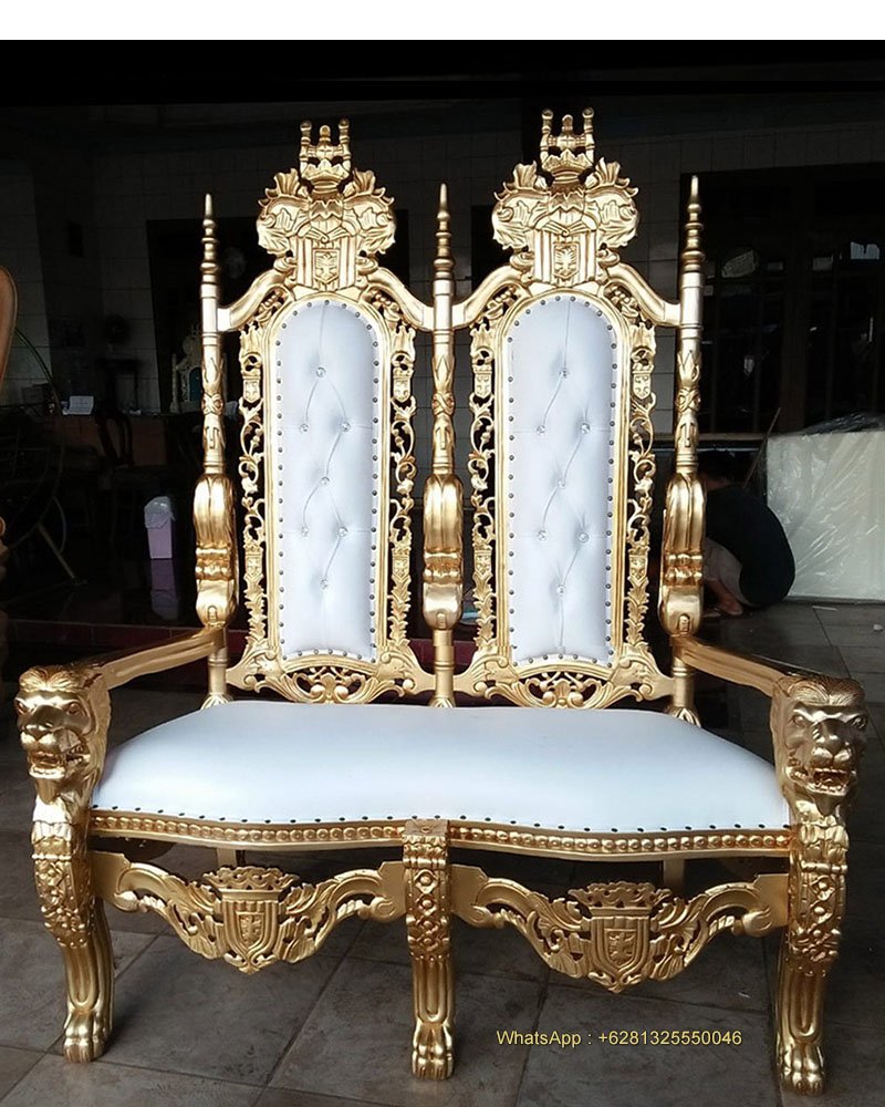King Lion Throne 2 Seater, Mahogany wood, Gold with gold foil, White artificial leather, Crystal depth button, nice carving, beautiful finish, good quality, good price. Living room furniture, Wedding decoration and special event. Ready for Export and Indonesia delivery.