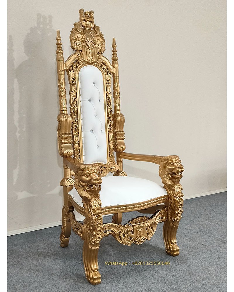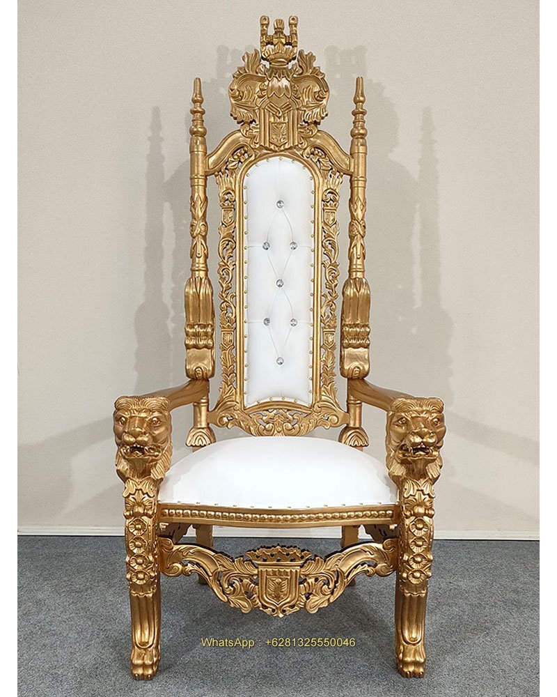 King Lion Chair, Mahogany wood, Gold finish ( Plain Gold ), White artificial leather, Crystal depth button, nice carving, beautiful finish, good quality, good price. Living room furniture, Wedding decoration and special event. Ready for Export and Indonesia delivery.