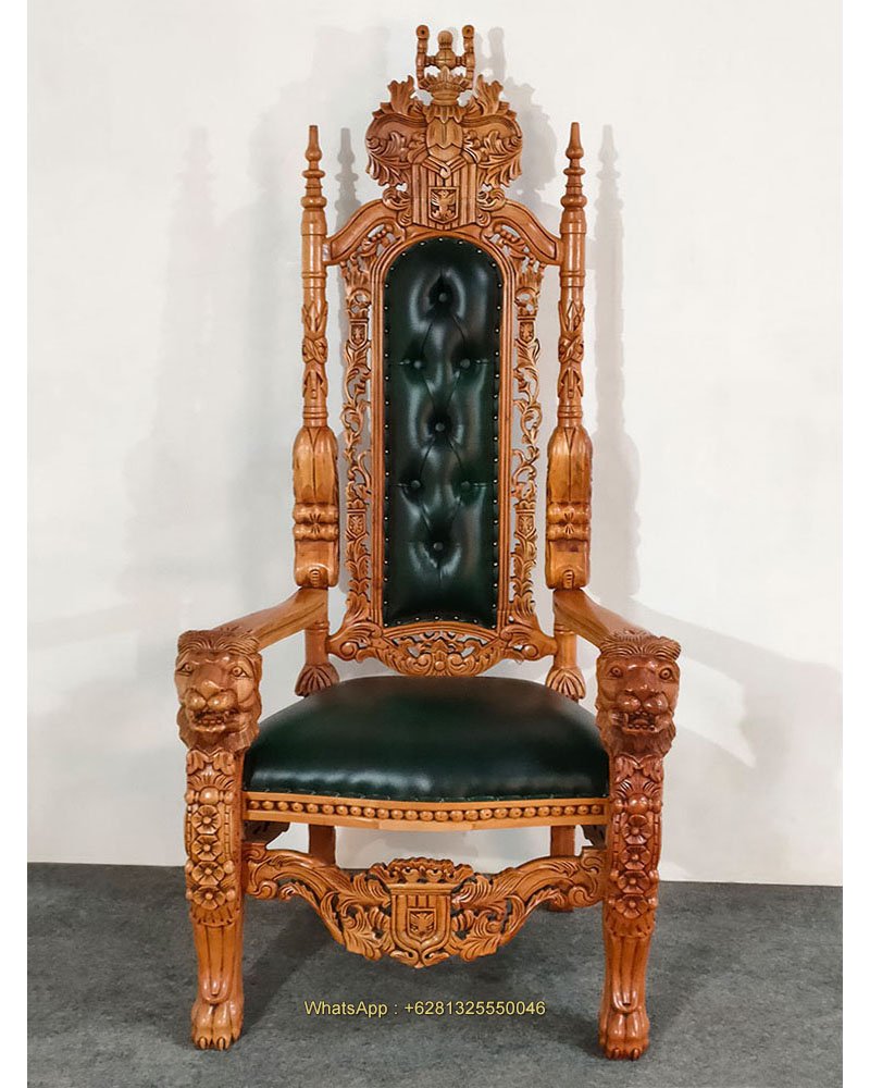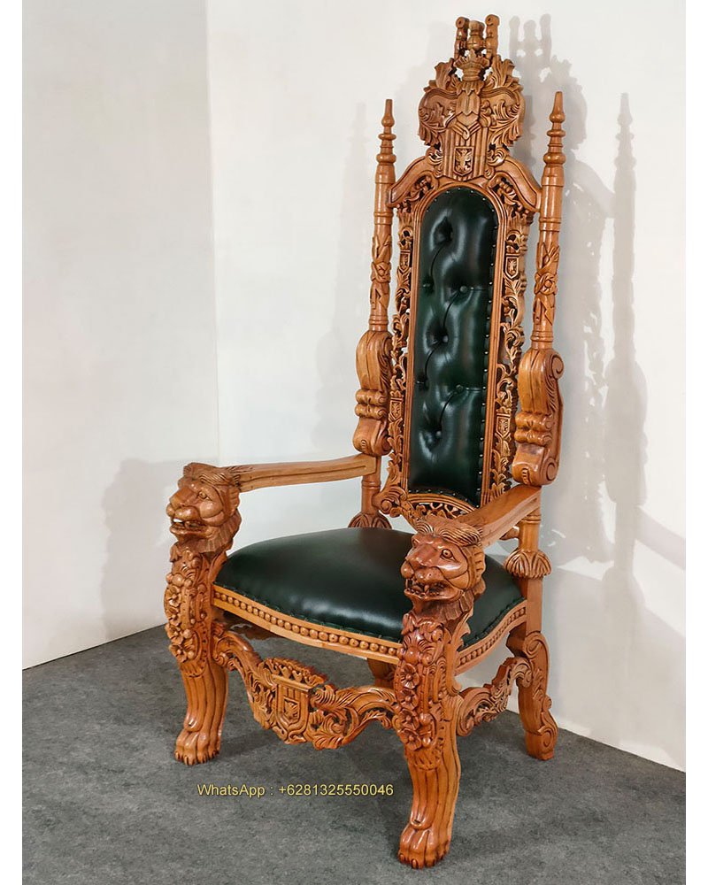 King Lion Throne Chair, Mahogany wood, Natural Mahogany Antique ( Little Glaze ), Dark green artificial leather, Leather depth button, nice carving, beautiful finish, good quality, good price. Living room furniture, Wedding decoration and special event. Ready for Export and Indonesia delivery.