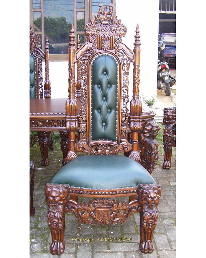 Lion Dining Chair no Arm, Mahogany wood, Walnut Antique ( More Glaze ), Green artificial leather, Leather depth button, nice carving, beautiful finish, good quality, good price. Living room furniture, Wedding decoration and special event. Ready for Export and Indonesia delivery.
