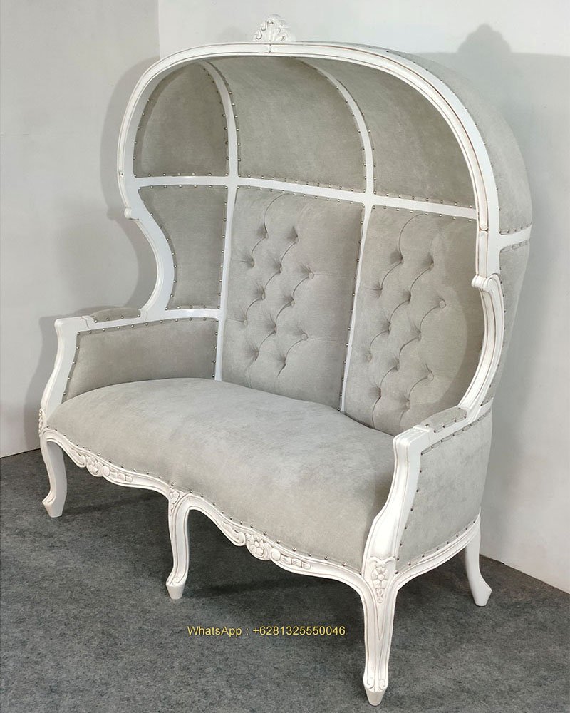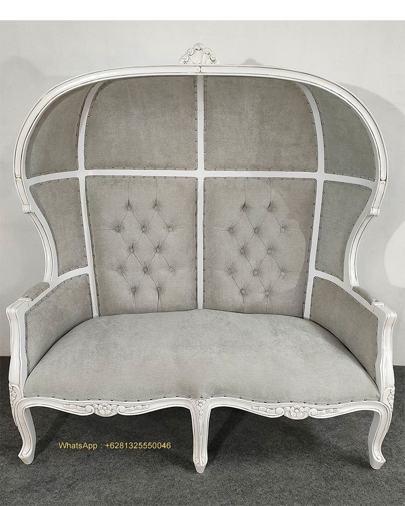 Lola Throne 2 Seater, Mahogany wood, White Antique ( Little Glaze ), Rivoli nimbus 318, Fabric depth button, nice carving, beautiful finish, good quality, good price. Living room furniture, Wedding decoration and special event. Ready for Export and Indonesia delivery.