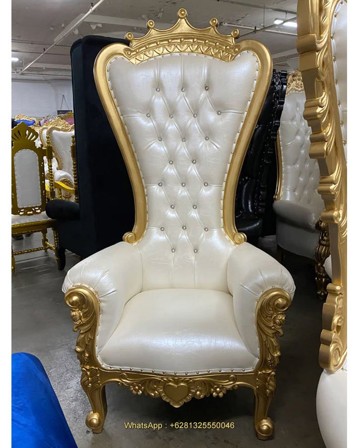 Love Crown Throne Chair, Mahogany wood, Gold finish ( Plain Gold ), Shiny White artificial leather, Crystal depth button, nice carving, beautiful finish, good quality, good price. Living room furniture, Wedding decoration and special event. Ready for Export and Indonesia delivery.