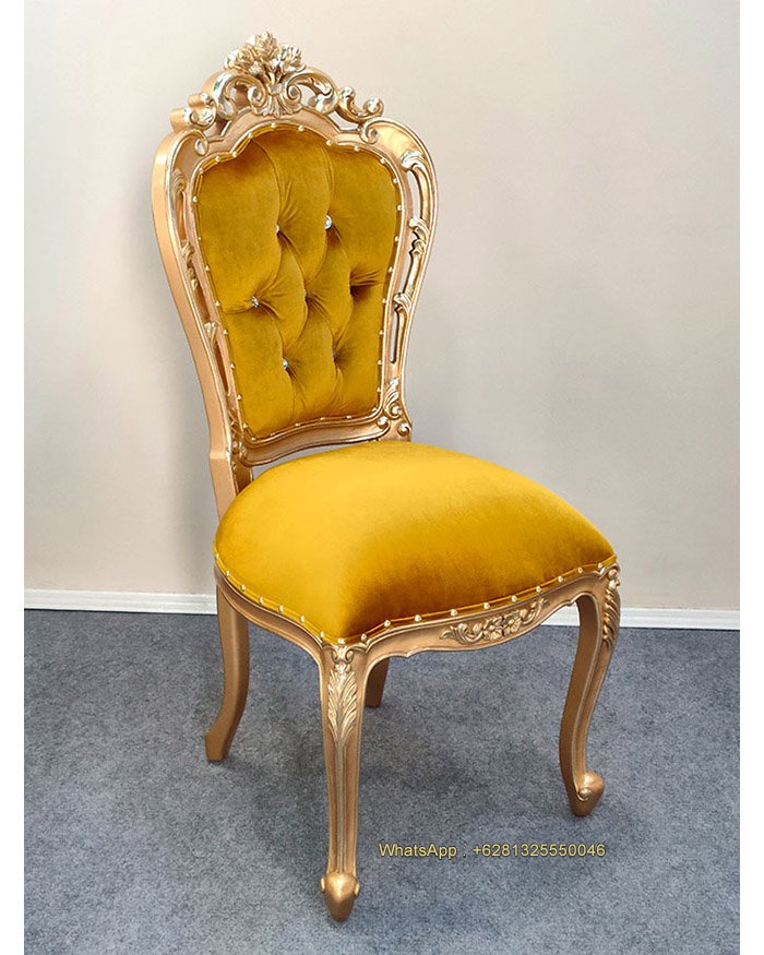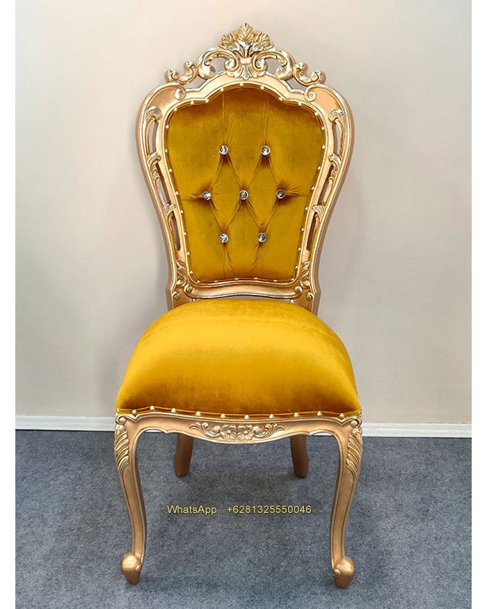 Mia Chair no Arm, Mahogany wood, Gold with gold foil, Gold velvet fabric, Crystal depth button, nice carving, beautiful finish, good quality, good price. Living room furniture, Dining room, Wedding decoration. Ready for Export and Indonesia delivery.