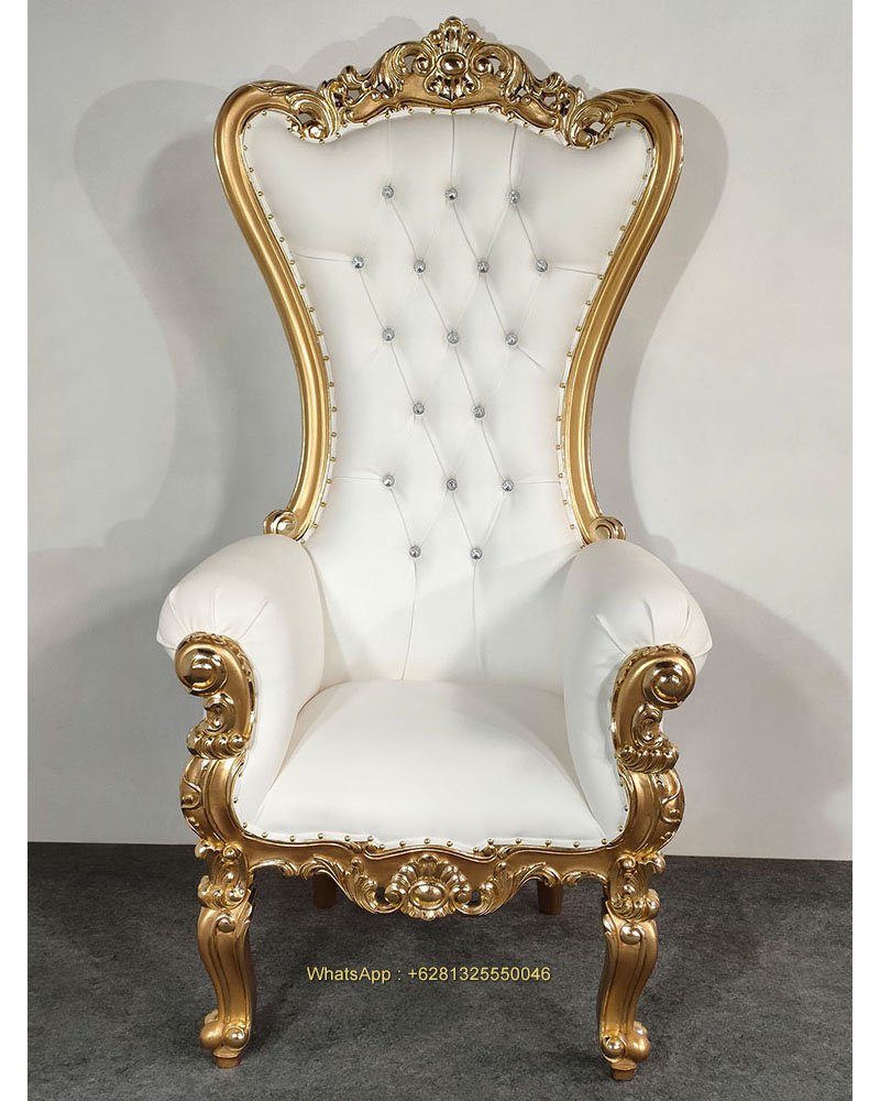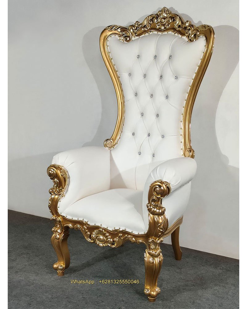 Selena Throne Chair, Mahogany wood, Gold with gold foil, White artificial leather, Crystal depth button, nice carving, beautiful finish, good quality, good price. Living room furniture, Wedding decoration and special event. Ready for Export and Indonesia delivery.