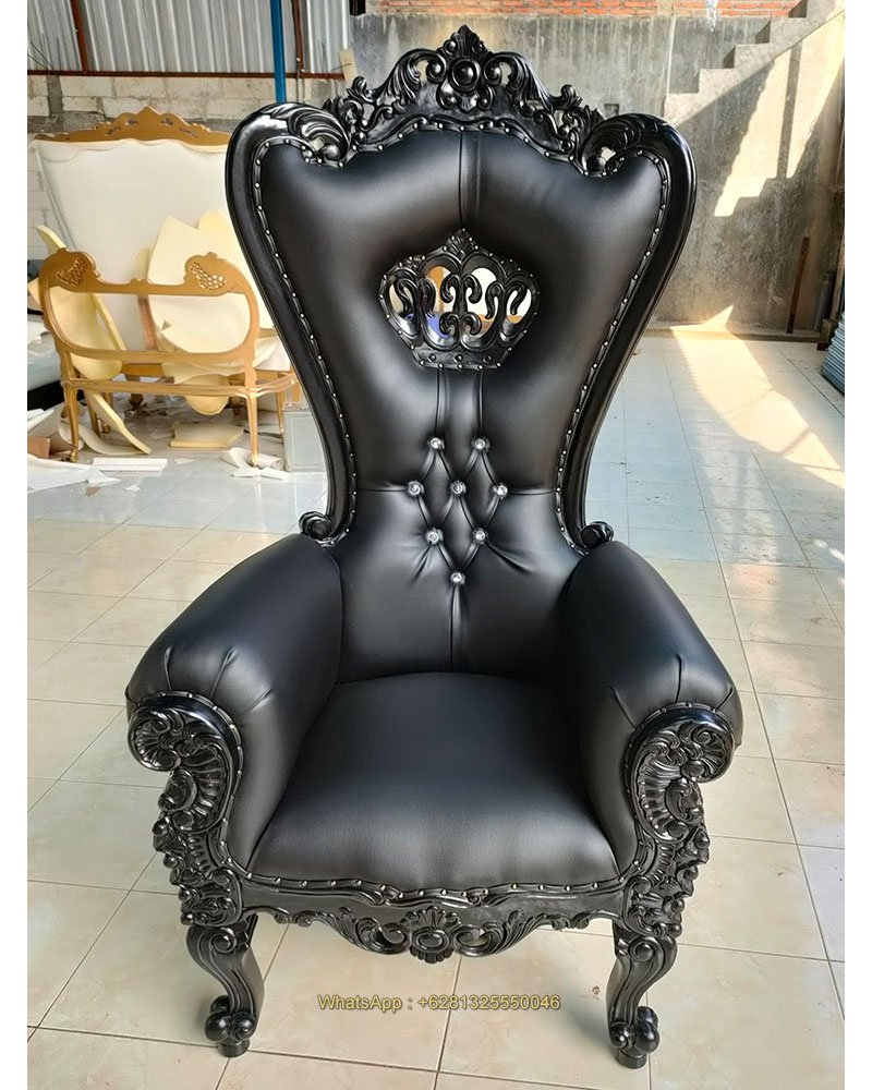 Selena Crown Throne Chair, Mahogany wood, Black finish ( Plain Black ), Black artificial leather, Crystal depth button, nice carving, beautiful finish, good quality, good price. Living room furniture, Wedding decoration and special event. Ready for Export and Indonesia delivery.
